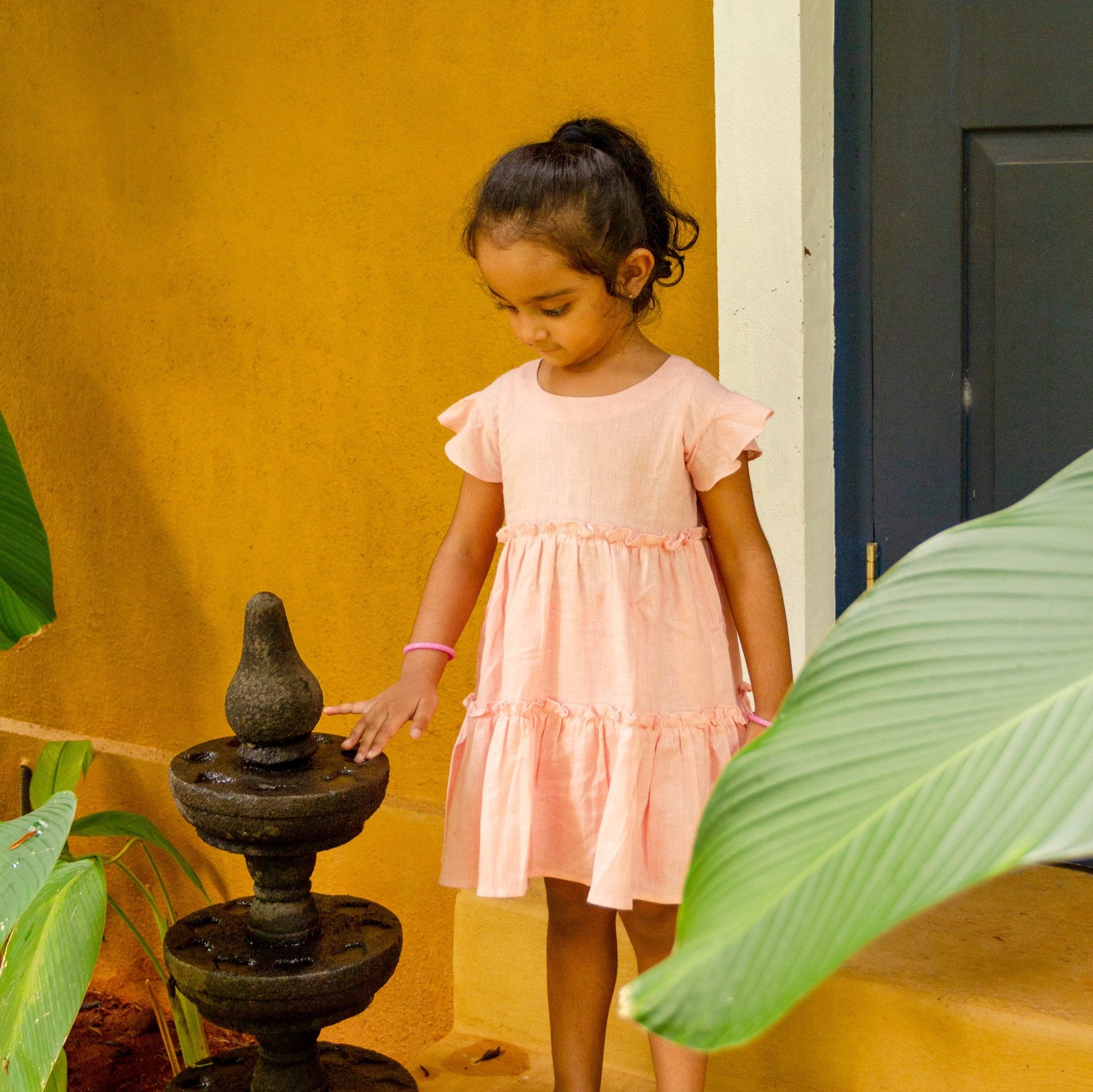 A beautifully crafted dress in GOTS certified linen ecovera fabric for a soft, earthy feel. Featuring flounce sleeves, a delicate button-back closure, and a gathered tiered skirt, this dress combines timeless style with thoughtful details.